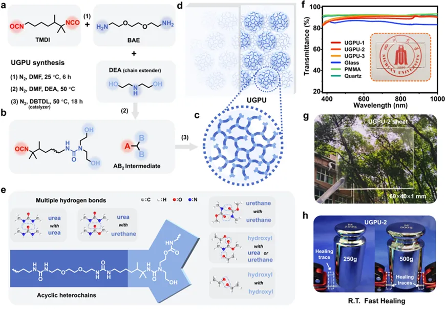 吴锦荣教授团队报道了一种室温下能快速修复的玻璃态超支化聚氨酯(UGPU)。在这项工作中,研究人员通过偶联单体法反应得到了具有无环杂原子链和超支化结构的聚氨酯材料(图1)。这种独特的分子结构将超支化聚合物的高分子运动性与聚氨酯的多重氢键相结合,构成了基于脲键、氨基甲酸酯键和支化末端羟基的高密度氢键网络。UGPU的拉伸强度高达70 MPa,储能模量2.5 GPa,玻璃化转变温度远高于室温(53 ℃),因此,UGPU是一种刚性的透明玻璃态塑料。