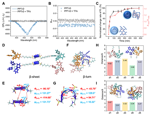 图3 (A, B) PPT-O组装体在三氟乙酸(TFA)处理前后的CPL谱图(A)和发光不对称因子(glum)曲线(B)。(C)PPT在不同氧化时间下的荧光变化率的归一化值以及1636 cm-1与1668 cm-1红外吸收峰强度比值(A1636/A1668)。(D-I)通过DFT计算得到的PPT和PPT-O的二级结构(D, F)、主链的二面角(E, G)以及在相对较近距离处测量的C-H···π相互作用(H, I)。红色虚线表示氢键。