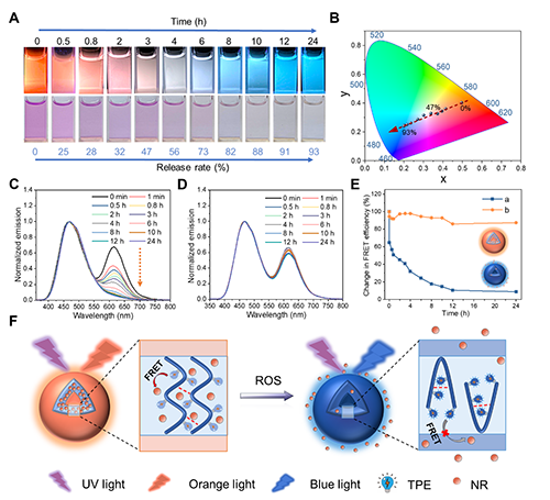 图4 (A)365 nm紫外光(上图)和白光(下图)照射下,用10% H2O2和5%乙酸处理的NR@PPT的药物释放过程图像。(B)NR释放过程中NR@PPT体系的荧光发射颜色的国际照明委员会(CIE)坐标图及其线性拟合。(C, D)氧化(C)和未氧化(D)NR@PPT的荧光光谱。(E)氧化和未氧化NR@PPT的FRET效率变化率。(F)颜色报告型药物释放过程示意图。