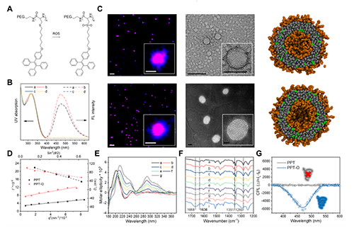 图2 (A)PPT和PPT-O的结构式。(B)PPT(a, c)和PPT-O(b, d)在氯仿中(c, d)和组装体(a, b)状态下的荧光发射光谱(激发波长λex = 318 nm)。(C)PPT(上)和PPT-O(下)组装体的CLSM图像(左)、TEM图像(中)和DPD模拟中的典型横截面视图(右)。(D)PPT和PPT-O自组装溶液的光散射数据:(实线)多角度SLS的典型Berry图;(虚线)不同入射角下的流体动力学直径相关函数。(E)PPT组装体在不同氧化时间下的CD谱图。(F)PPT组装体在不同氧化时间下的FTIR谱图。(G)PPT和PPT-O组装体的CPL谱图。