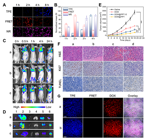 图5(A)氧化条件下与NR@PPT培养不同时间的MCF-7细胞的CLSM图像。(B)不同通道细胞内荧光强度的半定量分析。(C, D)给药后不同时间点的荷瘤小鼠(C)和24小时后的离体组织(D)成像结果。a、b、c分别表示游离DOX、DOX@PPT-O和DOX@PPT。(E)不同处理组小鼠的肿瘤体积变化。(F)肿瘤组织的代表性H&E染色、Ki67和TUNEL免疫荧光染色结果。a、b、c、d分别表示生理盐水、游离DOX、DOX@PPT-O和DOX@PPT。(G)治疗18天后的小鼠体内收集的肿瘤组织的CLSM图像。a、b分别表示DOX@PPT-O和DOX@PPT。