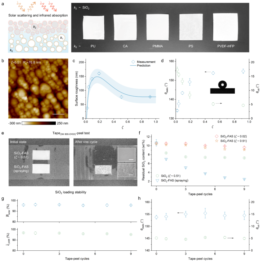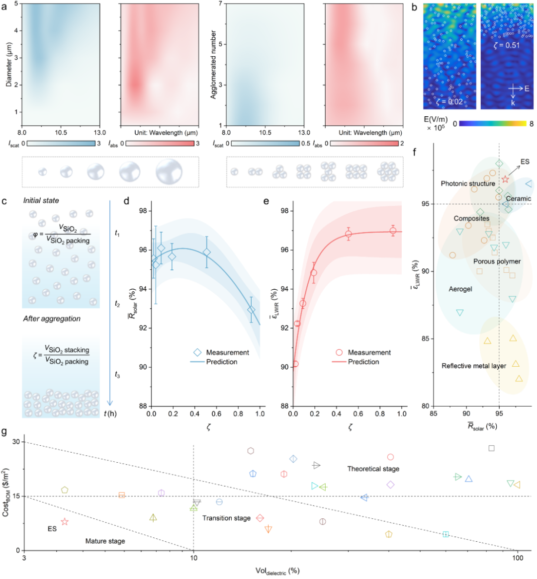 近日,8bo8足球比分 邓华教授团队利用“重力诱导粒子聚集”策略,构筑了一种具有可控电介质分布状态的稳定RC超材料。通过调控聚合物骨架中介电二氧化硅(SiO2, 4 vol%)的面内外聚集状态,以实现跨越两数量级波段(0.3-25 μm)的解耦光谱响应,即太阳反射率和红外发射率的同步优化。特定聚集条件下,聚合物微孔和电介质纳米孔可完全覆盖紫外至近红外波段的Mie散射,而电介质聚集所诱导的后向散射至前向散射的转变、以及自由空间中表面SiO2的声子增强Fröhlich共振则显著增强了红外消光特性。这种设计优化了传统三元RC体系(聚合物/电介质/孔隙)的材料变量、尺寸属性及空间分布效应,从而在单一超材料中同时结合了~96%太阳反射率和~97%红外发射率。正因如此,该材料在70 ℃的焦耳热源表面可提供5-8 ℃冷却效果,而在夏季太阳直射条件下,也支持非加热介质低于环境约5 ℃。更重要的是,上述策略可以很轻易地扩展至其它聚合物类型,并通过光子表面构建稳定耐用的抗污和抗剥离特性,以适应大多数RC场景。该工作以“Dielectric Aggregation-Mediated Dual-Band Robust Optical Performance for Low-Cost Radiative Cooling”为题发表在《Advanced Materials》上(Adv. Mater. 2025, 2504150)。文章第一作者是硕士研究生熊联虎。该研究得到国家科学技术部(重点研发计划)的资金支持。
