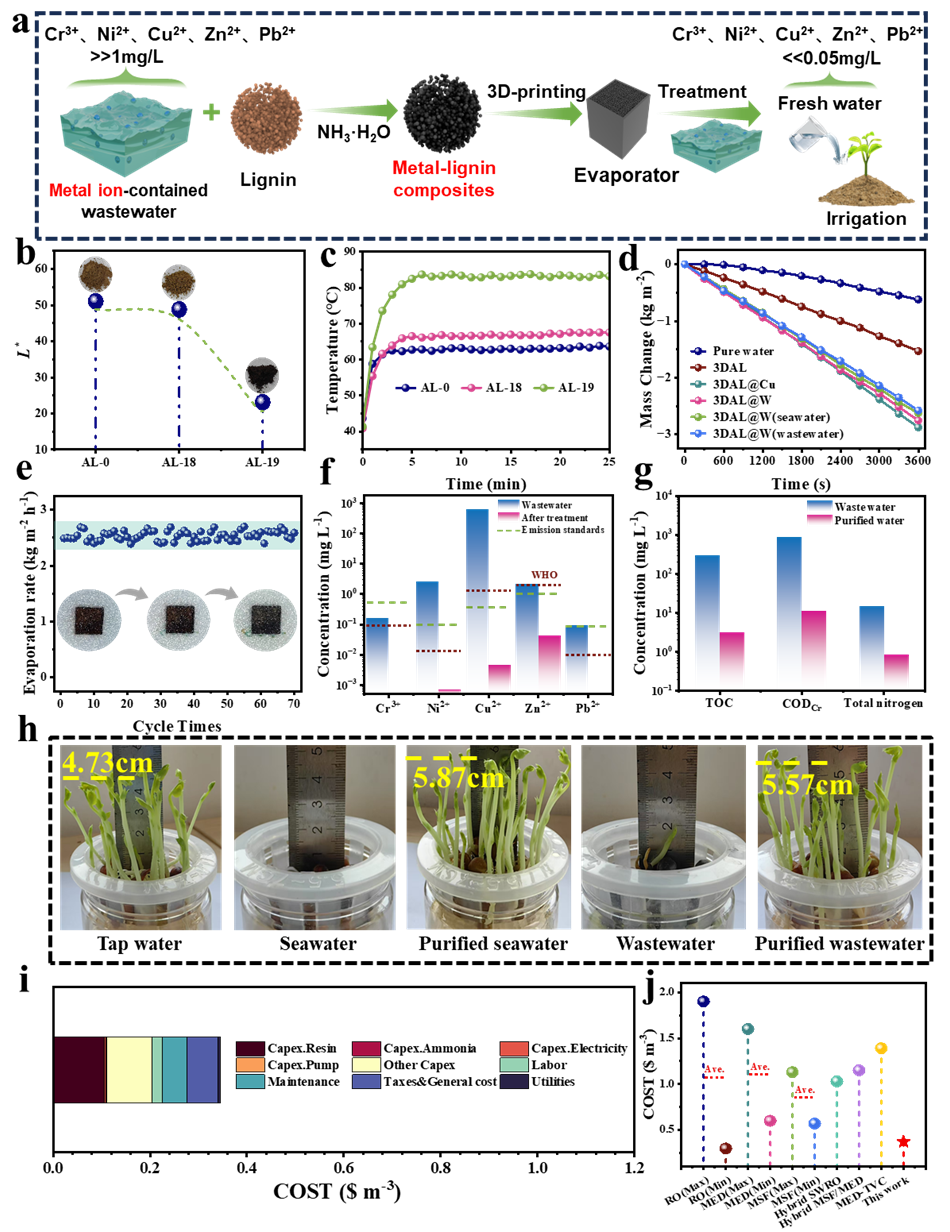 木质素具有来源广泛和可再生的鲜明特点,是极具成本效益的生物基材料。其固有的光热转换特性使其在太阳能界面蒸发领域备受关注。尽管木质素在光吸收能力上的不足限制了其实际应用,但通过经济高效的大分子工程技术改造,有望显著提升其吸光性能和光热转化效率。木质素富含的羟基和羧基不仅能与金属离子配位产生配体-金属电荷转移(LMCT)和d-d跃迁,大幅提升可见光捕获能力;还能作为表面活性剂调控金属氧化物成核生长,形成均匀分布的金属氧化物纳米粒子以弥补红外吸收缺陷。更重要的是,由此制备的金属-木质素复合材料将表现出对重金属离子腐蚀的极强耐受性。近期,四川大学李乙文/杨振团队利用富含重金属离子的工业废水提高木质素的光吸收和光热转换效率,首次制备了MLC,并以此来提高废水处理效率。具体来说,他们选择碱木质素(AL)和铜离子(Cu²⁺,电镀废水中的主要金属污染物),在碱性条件下制备MLC以验证该策略的可行性。与原始木质素相比,这些MLC表现出显著增强的光吸收和光热转换性能,是一类富有前途的光热试剂(图1)。随后作者系统探究了MLC光吸收增强与光热性能提升的内在机制。XPS光谱证实了金属离子的氧化作用,Cu²⁺将酚结构氧化为醌结构,从而促进了木质素吸收光谱红移。FT-IR和Raman光谱证实了Cu→O、Cu→N配位键的形成。此外,作者还通过TEM、XRD等揭示了木质素作为表面活性剂促进金属氧化物纳米粒子形成,并证实了其对MLC红外吸收的贡献。总之,在氧化、配位和金属氧化物纳米粒子的协同作用下,MLC实现了全太阳光谱的高效吸收。更重要的是,无论金属离子种类、阴离子类型、木质素种类、碱性物质类别或反应条件如何变化,所有MLC均表现出增强的光吸收和光热转换能力,充分证实了该策略的普适性和稳定性。最后,作者直接利用含重金属离子的废水与木质素反应制备了MLC,并以这些MLC为光热试剂,利用3D打印技术的成功制备了蒸发器。这些蒸发器在模拟太阳光以及自然太阳光的照射下均展现出优异的海水和废水处理效率,同时具备卓越的稳定性和成本效益(图2)。