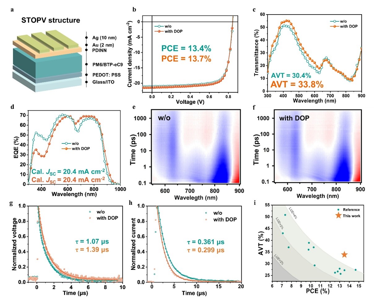 有序性的提升为器件性能带来了明显的提高。在有机场效应晶体管中,DOP处理将基于PM6的器件的平均空穴迁移率从0.15 cm2V−1s−1提升至0.20 cm2V−1s−1,增幅达33.3%。在应用前景广阔的半透明有机太阳能电池中,该策略展现出独特优势:器件在维持13.7%光电转换效率的同时,平均可见光透过率由30.4%提升至33.8%。这主要归因于更有序的分子堆积导致吸收光谱半高宽收窄、吸收拖尾减弱,使得器件在视觉上更透明。进一步的器件物理分析表明,器件吸光变少但光电流基本不变源于双分子复合受到抑制、电荷载流子寿命延长以及电荷提取能力的增强。最终,电池获得了高达4.63%的光利用效率,为目前无光学结构半透明有机太阳能电池的最高值之一。该工作不仅提出了一种简单、通用且高效的新方法抑制有机半导体的能量无序,还从分子相互作用的层面深化了对有机半导体聚集行为的理解,为制备高性能有机电子器件开辟了新途径。