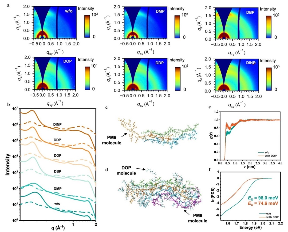 研究团队开发了一系列邻苯二甲酸酯类的组装诱导剂,发现组装诱导剂在多种p型有机聚合物半导体中均存在一定的普适性,并通过多种表征手段,从分子到器件层面系统研究了组装诱导剂的作用机理。以组装诱导剂邻苯二甲酸二辛酯(DOP)和p型有机聚合物半导体PM6为例,紫外-可见吸收光谱表明,经DOP处理后,PM6薄膜的0-0/0-1峰强度比提升,吸收半高宽收窄11%,吸收拖尾被显著抑制,这一定程度上表明了分子排列有序度的提高。掠入射广角X射线散射结果表明,组装诱导剂显著增强了PM6聚合物的层状堆积和π-π堆叠有序性,相干长度大幅增加。分子动力学模拟进一步揭示,DOP分子分布于PM6堆积簇周围,通过与侧链相互作用,诱导分子骨架形成更具序性的长程排列。光热偏转光谱证明,经过DOP处理后,PM6薄膜的乌尔巴赫能从98.0 meV显著降低至74.6 meV,降低了24%,标志着能量无序性得到了有效抑制。
