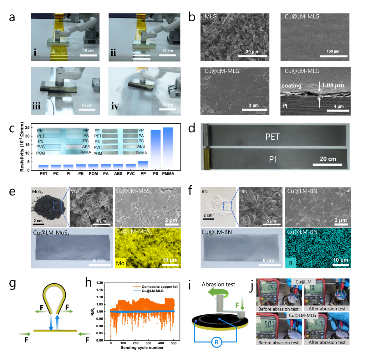 如图1所示,研究首先对比了LM在传统刮涂和刷涂条件下的表面润湿铺展行为。由于LM本身表面张力较高,在常规涂覆方式下容易收缩为离散液滴或条带,难以在聚合物表面形成均匀、连续的超薄导电层。针对这一问题,团队提出了基于泡棉擦涂的表面原位复合成型策略:在泡棉的限域、挤压和强剪切共同作用下,LM可在基底表面实现受迫润湿,并形成微米甚至纳米尺度的薄层涂覆。进一步地,通过引入MLG等二维材料以及铜纳米颗粒改性液态金属(Cu@LM),构筑具有有序层状结构和机械互锁界面的复合功能皮肤。该结果表明,泡棉摩擦不仅是一种简便的涂覆方式,也可作为实现LM表面原位复合与功能皮肤构筑的新型加工手段。
