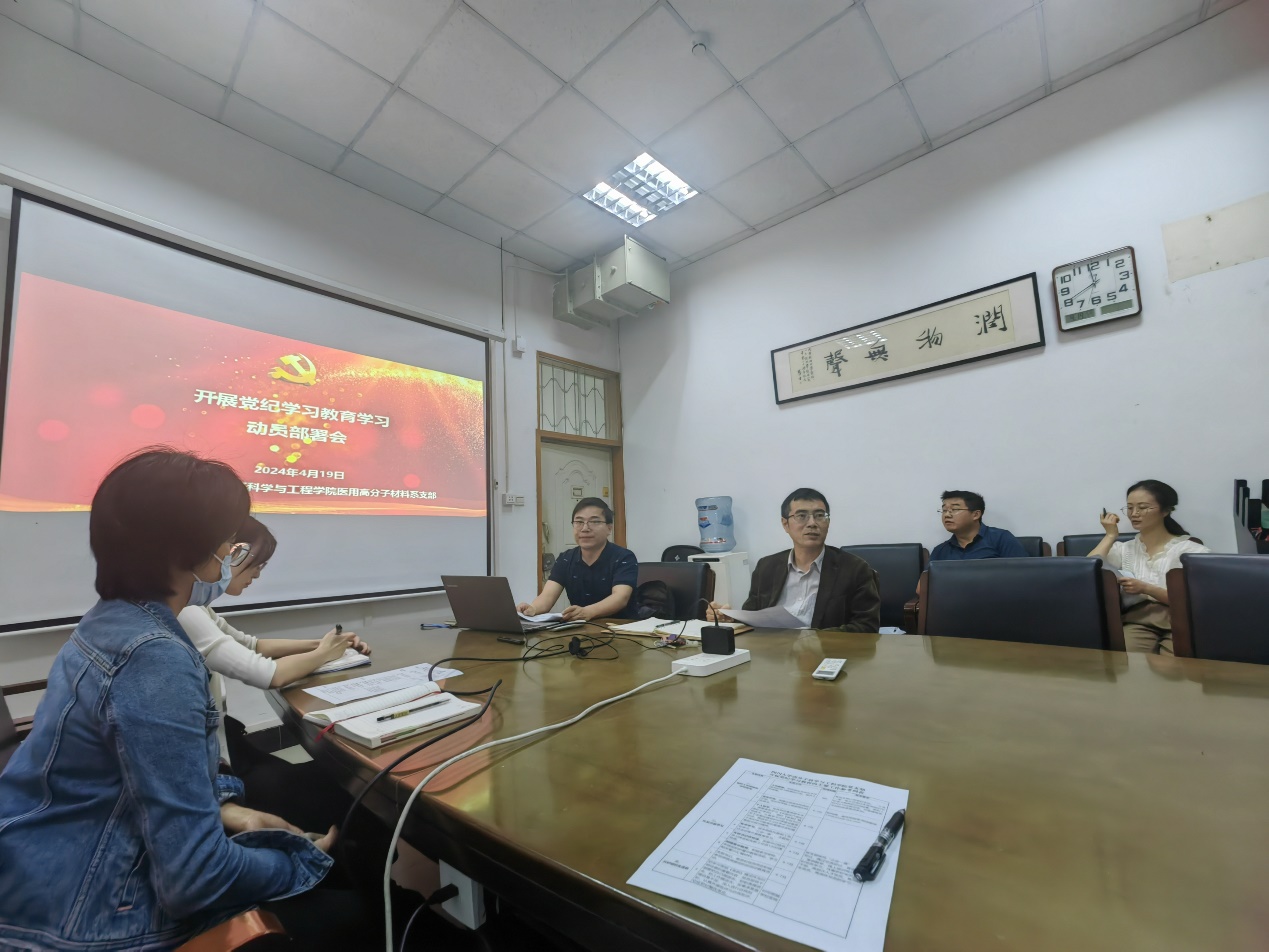 为深入领会习近平总书记关于党纪学习教育的重要讲话和重要指示批示精神,贯彻落实中央党的建设工作领导小组会议和《中共中央办公厅关于在全党开展党纪学习教育的通知》精神、8bo8足球比分 医用高分子材料系党支部于2024年4月19日上午在8bo8足球比分 主楼205会议室召开党纪学习教育动员部署会,并开展了主题为“严守党规党纪,强化自我约束”的党纪学习研讨活动。会议由医用高分子材料系支部书记赵伟锋主持,支部全体党员参加,8bo8足球比分 党委委员、院长杨伟出席活动。