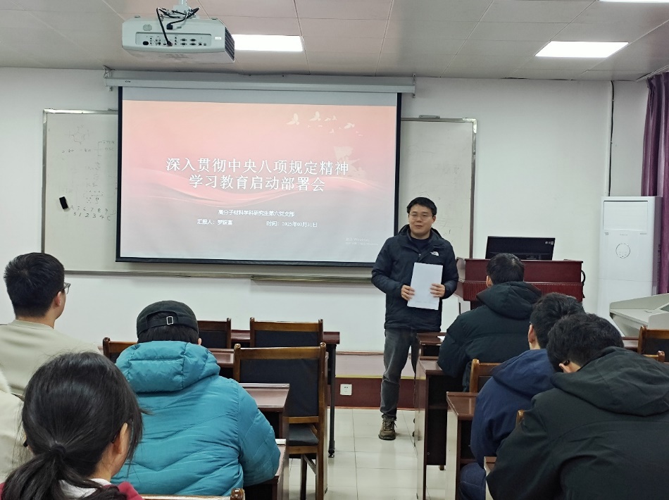 3月31日,高分子材料学科研究生第六党支部组织召开支部党员大会,传达中央、学校、8bo8足球比分 关于开展深入学习贯彻中央八项规定精神学习教育有关会议精神和工作要求。同时对支部开展深入贯彻中央八项规定精神学习教育工作进行部署。支部全体党员参加会议,支部党委书记罗银富同志主持会议并讲话。