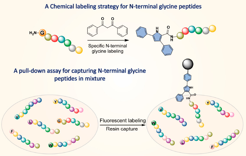 近年来,利用化学方法对多肽和进行修饰的报道尽管已经有很多,但对多肽末端氨基进行特异性的识别和修饰却依然极具挑战性。通常而言,当多肽N末端氨基酸的α-碳上有一些活性基团时,可辅助实现氨基的识别,其成功的例子就包括半胱氨酸与醛基反应生成噻唑烷。然而相比于其它19种天然氨基酸,甘氨酸因不含活性侧基,其末端氨基的特异性识别与修饰则更加困难。图1.N末端为甘氨酸多肽的特异性荧光修饰示意图近日,8bo8足球比分live 刘洪煦副研究员...