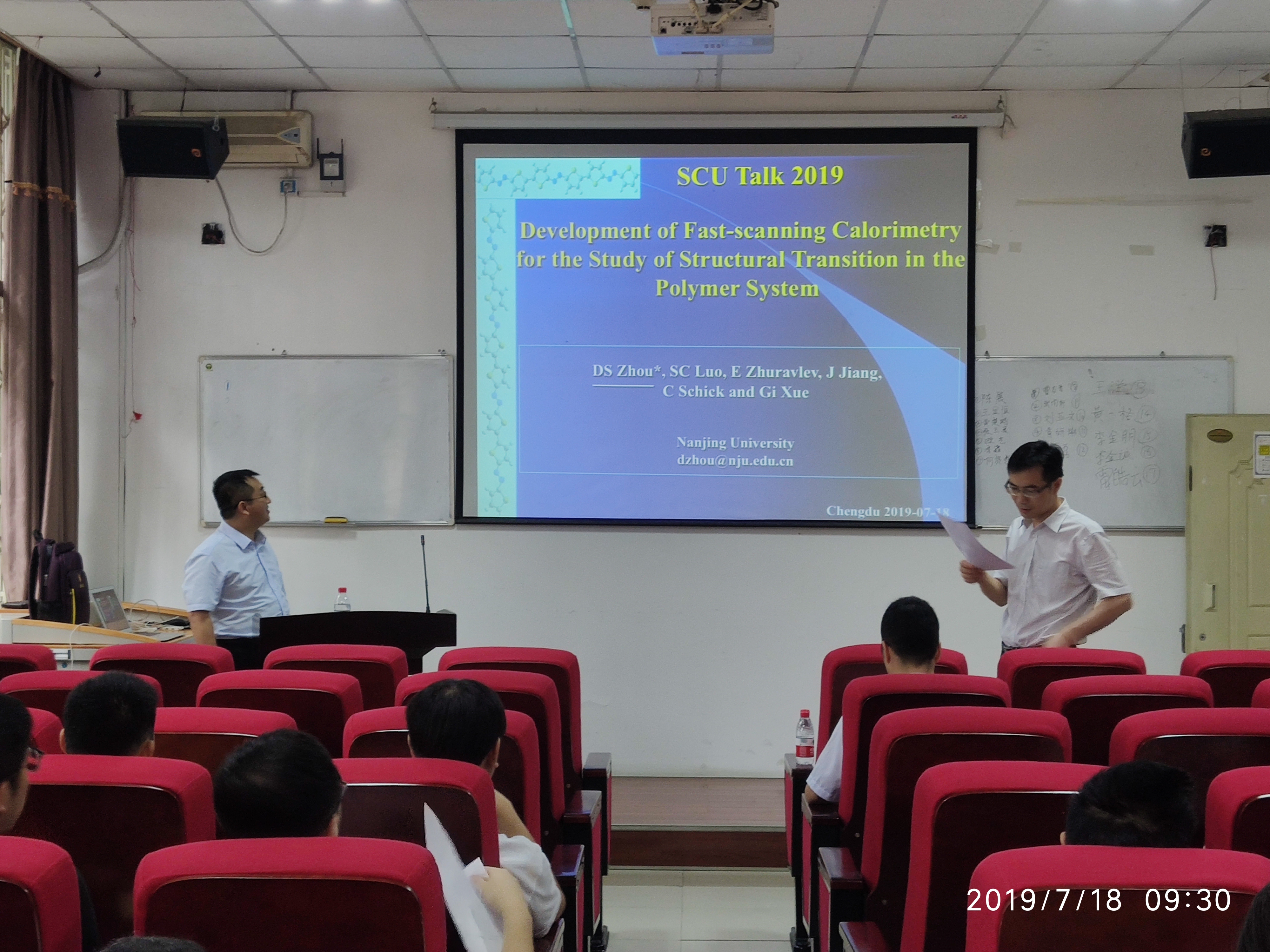 2019年7月18日,应8bo8足球比分 吴锦荣教授邀请,南京大学化学化工8bo8足球比分 周东山教授来到8bo8足球比分live ,为8bo8足球比分live 师生作题为“Development of Fast-scanning Calorimetry for the Study of Structural Transition in the Polymer System”的学术报告。8bo8足球比分 副院长杨伟教授主持报告。周东山教授从量热方法中不同升温速率应用范围出发,介绍了快速量热法的特点以及这一方法在聚合物表征方面的应用,重点讲述了该方法在受限态聚合物的表征、共轭高分子的...